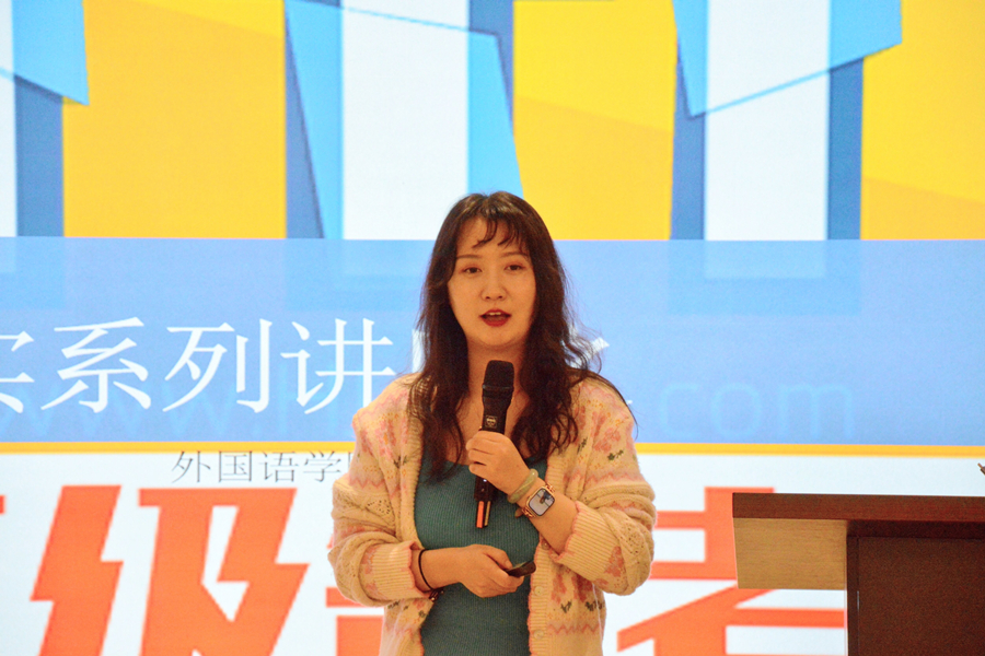 在互动提问环节中,同学们就听力材料的选择、如何判断自己的单词表达是否地道以及英译中、中译英的翻译技巧提出了自己的疑问。徐溱圻强调精读在口译中积累的重要性,分享了相关练习的学习资源,并针对翻译技巧强调要掌握翻译理论,注重中英互译的顺序和灵活性。