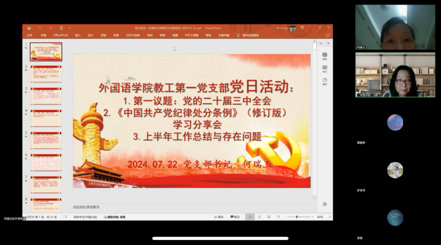 为进一步推动党纪学习教育走深走实,提高党员的纪律意识和规矩意识,澳门十大网投平台排行教工第一党支部于7月22日晚,在线上开展了新修订的《中国共产党纪律处分条例》(以下简称《条例》)学习分享的主题党日活动。党支部书记何瑞玉主持会议。