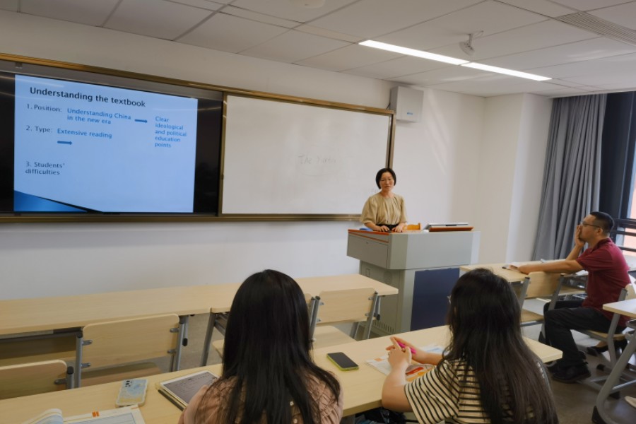 袁鑫充分肯定了教师们为钻研教材和精心备课做出的努力和创新想法,他带领大家阅读了本教材的前言部分,并从理念、目标、方法、层次和连接五个方面分析了教材的使用方法。他指出,该教材可以帮助教师更好地实现课程思政的教学目标,需要教师们基于知识建构与技能形成融合的原则和个人的特点设计多样化和个性化的教学设计。