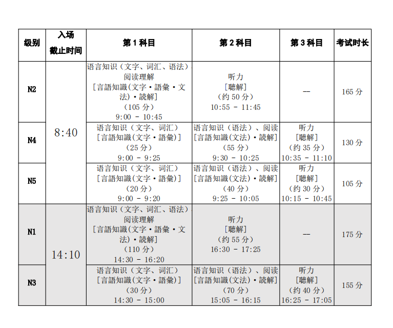 N1和N3考生中午12点开始可以入校,下午2点05分禁止进入考点,2点10分禁止进入考场