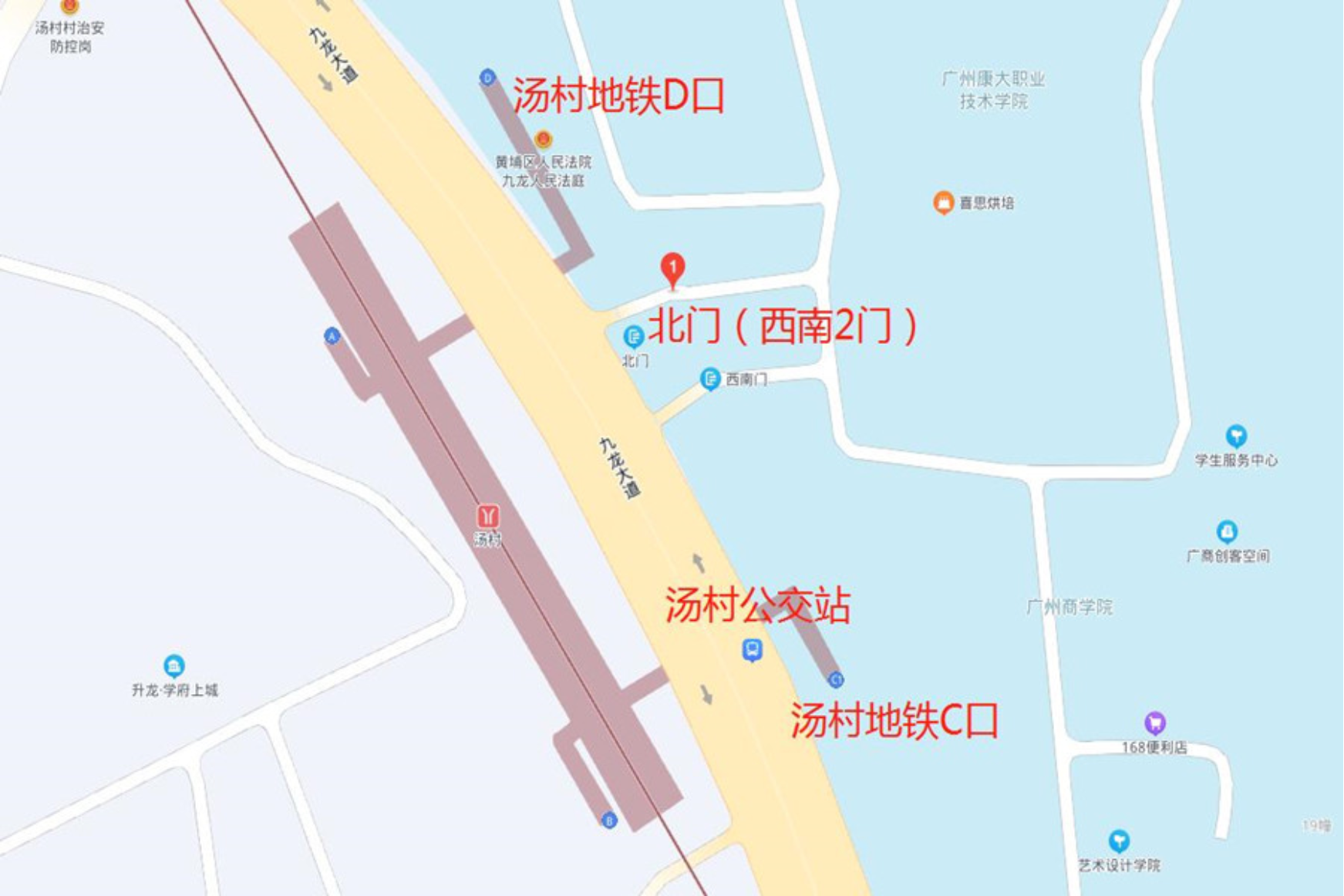 ②自驾车者可从不同的线路进入广汕公路(G324)→九龙大道→广商北门(西南2门)。