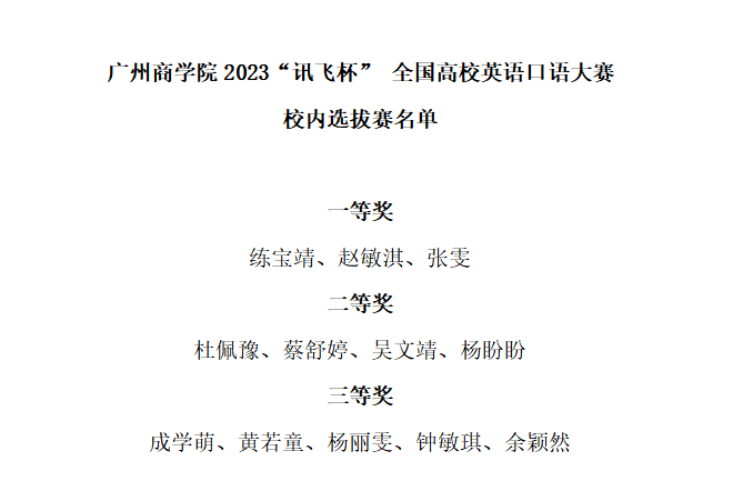 6月20日,2023“讯飞杯”全国高校英语口语大赛决赛落下帷幕,十大网投平台排行英语专业学子喜获佳绩,2020级张雯、练宝靖、赵敏淇分别获得广东赛区本科组二等奖、三等奖及优秀奖。