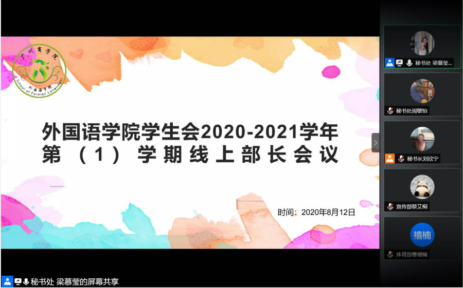 为了加强部门间的交流,更好的落实学生会工作。澳门十大网投平台排行学生会于2020年8月12日晚19:30在腾讯会议平台召开了2020-2021学年第(1)学期线上部长会议。此次会议围绕“加强部门交流,共建和美外院”的主题,各部门针对近期工作总结,以及2020-2021学年规划等进行了简要汇报,出席本次会议的嘉宾有澳门十大网投平台排行党总支书记徐超,澳门十大网投平台排行学生会指导老师伍思颖,澳门十大网投平台排行学生会执行主席团以及各部门部长。