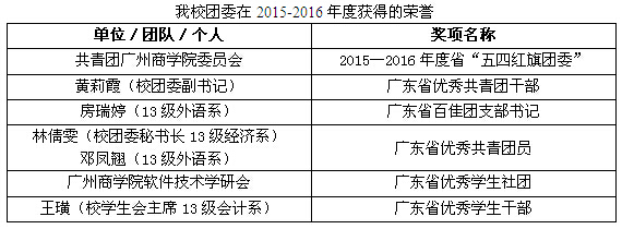 近日,从团省委《关于表彰2015-2016年度广东省优秀共青团员、优秀共青团干部、十佳团县委书记、百佳团支部书记、五四红旗团委(标兵)和五四红旗团支部(标兵)的决定》和省学联《关于表彰2015-2016年度广东省优秀学生会、优秀学生社团、优秀学生干部的决定》获悉,十大网投平台排行团委以及个人喜获多项荣誉称号(见下表)。