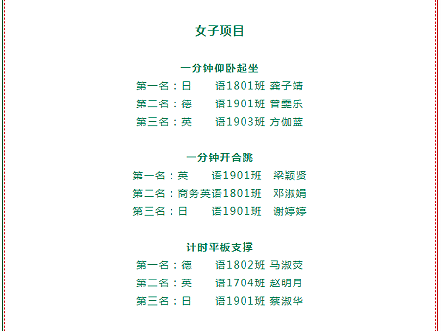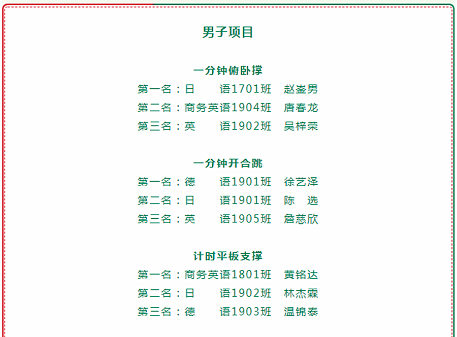本次竞赛面向澳门十大网投平台排行全体学生,参赛组别分为男子组和女子组。男子项目分别为1分钟俯卧撑、1分钟开合跳、计时平板支撑,女子项目分别为1分钟仰卧起坐、1分钟开合跳、计时平板支撑。室内体能挑战赛自5月6日启动以来,每天都有来自大量的参赛视频涌进邮箱。截止至5月15日18:00,体能大挑战共收到近两百份参赛视频。按照竞赛要求,经过严格的审核和评选,我们最终选出了各项竞赛项目的前三名。