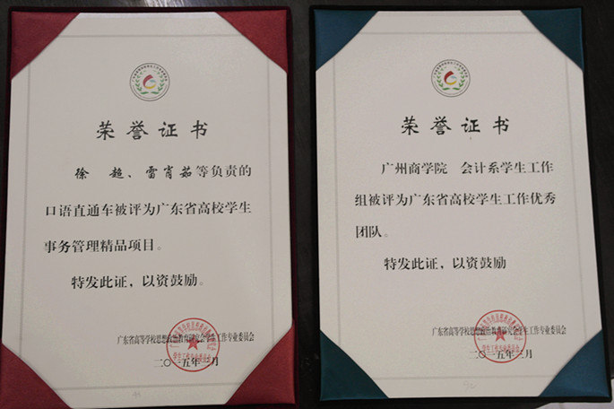“口语直通车”荣获“2014年广东省高校学生事务管理精品项目”。精品项目是指由院(系)辅导员或校、院(系)学生工作团队,持续开展实施三年(含 三年)以上,并取得明显育人成效,在校内外产生广泛影响的学生工作项目。经广东省高校学生工作专业委员会审定,评选出45个项目为广东省第三届“精品项 目”。
