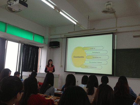 本次大学英语观摩课的授课老师分别是:杨家华、任青老师(英语视听说方向),李卓华老师(商务英语翻译方向)和冯彩云老师(英语时文阅读方向)。根据教研室收集的意见,各模块课都有比较鲜明的课程特色,教师讲课风格适合相应课程,注重实际应用并激发学生学习的兴趣。例如杨家华老师的视听说课堂气氛轻松幽默,用提问学生的方式一步步进入课文主题,很有启发性。任青老师的口语活动与时俱进,学练结合,条理层次分明。李卓华老师的翻译课程内容丰富,理论与实践结合紧密,对学生的商标翻译能力有很显著的提高作用。冯彩云老师的阅读课教授词根词缀,帮助学生扩展词汇量。