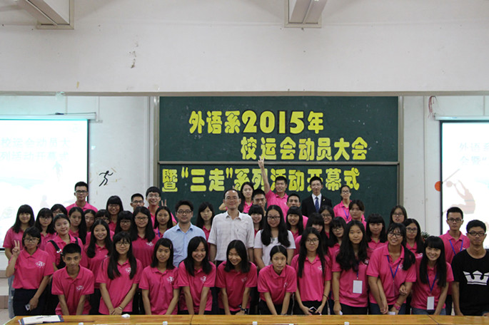 我系为积极响应共青团中央“走下网络、走出宿舍、走向操场”的号召,迎接即将到来的第十五届校运会,做好赛前各项准备工作。11月8日19:30,外语系在A109顺利举行“三走”系列活动开幕式暨第十五届校运会动员大会。学校团委副书记高建辉、外语系党总支书记徐超、学生会指导老师黄玉亭出席了本次动员大会;此外,还有外语系2015年校运会运动健儿、外语系方阵代表队、2015级各班班干部学生代表和校运会全体工作人员。