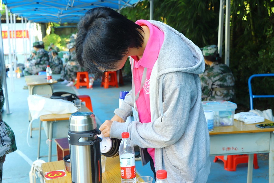 军训开始之际,澳门十大网投平台排行团学骨干团结一心,进行排班轮班,确保第四营的营队每一刻都有团学骨干在守护正在军训的新生们。军训开始时,团学骨干们早已在营地等待着新生们的集合,为他们准备好后勤服务设施以及各类医疗药物,保障军训期间身体不舒服的同学能够及时得到的救护。澳门十大网投平台排行团学骨干身着一身粉衣,穿梭忙碌于“绿色营队”之中,时刻为有需要帮助的同学们提供帮助。军训下训后,团学骨干们会热心关切新生们的军训情况和身体状态,确保能够及时给予新生们足够的关心。