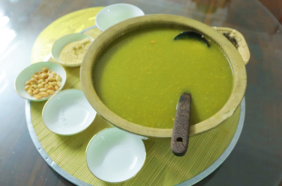 在制作“擂茶粥”必须有两件特别工具,一是擂盆,二是擂棍。准备的材料包括茶叶、炒花生、炒芝麻、生姜、盐巴、花生油等。茶叶选用山茶叶,制作擂茶粥时,先放茶叶于擂盆内,用擂茶棍研磨成粉末,将茶叶磨得越细越好。擂好茶叶后加入白芝麻、姜、盐巴、花生油一起擂成糊状,之后加入擂碎的炒花生,再用开水把擂好的糊开成茶汤。最后将煮好的粥倒入擂盆,擂茶粥就制作完成了。