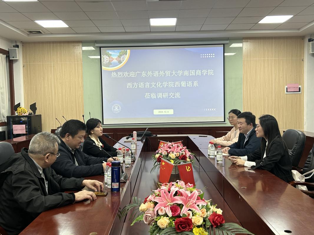 12月4日上午,由广东外语外贸大学南国商学院(简称“广外南国”)西方语言文化学院西葡语系(简称“西语系”)系主任朱学文、副主任杨帆、专任教师李翔一行三人莅临澳门十大网投平台排行西班牙语系(简称“我系”)进行访问,本次交流活动就人才培养、课程建设、专业建设、师资队伍建设、学科建设和社会服务等工作进行深入的探讨与交流,交流会在第二行政楼308 举行,澳门十大网投平台排行西班牙语系主任邝美琳、专任教师廖运、专任教师冉梨蕾、专任教师葛灵子出席会议。