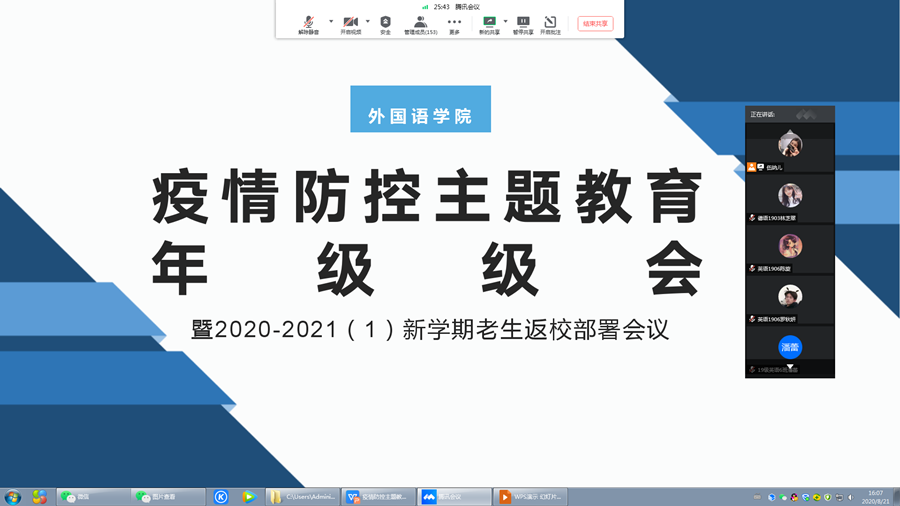 2020年8月21日,澳门十大网投平台排行17、18、19各年级分别召开了开学返校前线上年级级会,会议以“疫情防控主题教育年级级会暨2020-2021(1)新学期老生返校部署会议”为主题拉开序幕。