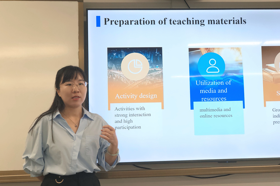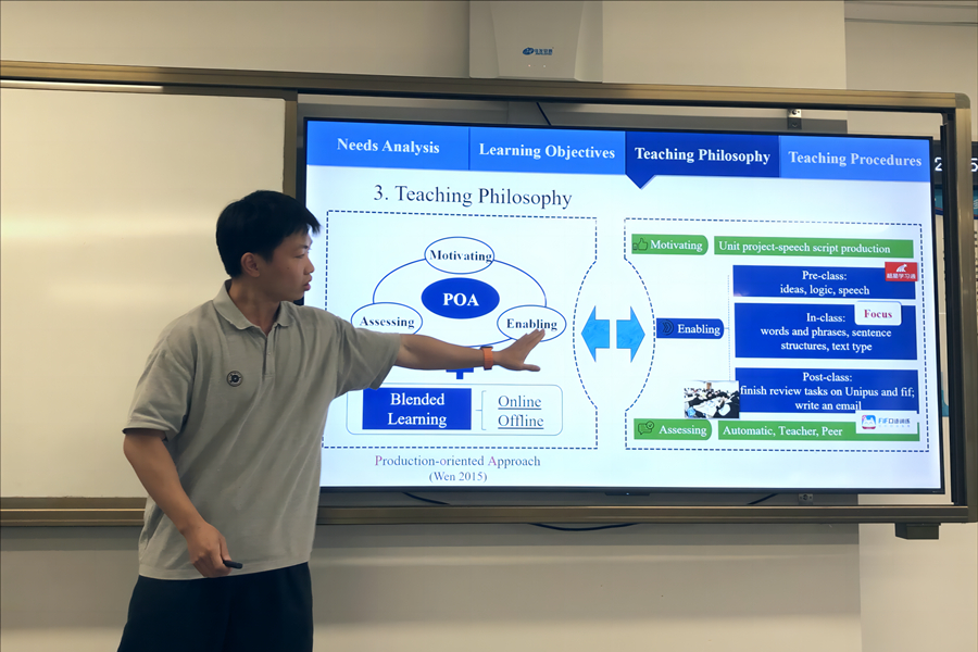 第一环节为说课环节,三位青年教师李梦林、陈紫钰、向泽广依次进行了专门用途英语II第16单元的说课展示。三位老师各有所长:李梦林老师的教学步骤细致入微,陈紫钰老师的教学设计实用性强,向泽广老师的说课PPT精美简练、规范专业。