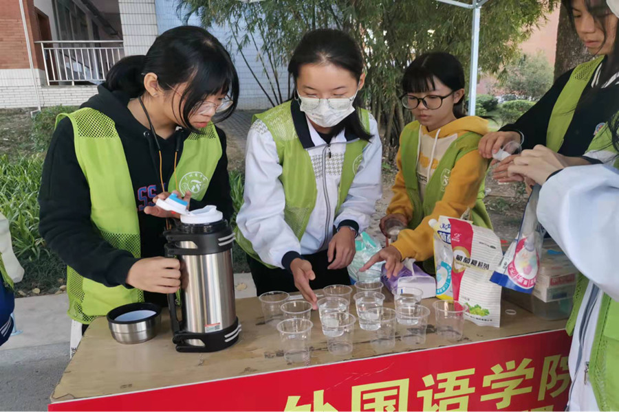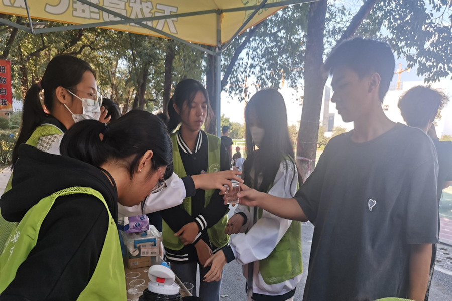 在体测开始前,19级学生党支部的党员、发展对象、积极分子和21级学生党支部的入党申请人在谢清玲老师的组织下有序集合,设立服务岗,并完成志愿服务前的准备工作。在准备过程中,各同学合理分工,如搭建帐篷、准备药品及饮用水等。体测进行时,志愿者们来回奔波于服务岗和跑道之间。他们及时为完成体测的同学送去热水,为身体不适的同学提供葡萄糖水、纸巾、药品等物资,搀扶体力不支的同学到休息处进行放松调整。