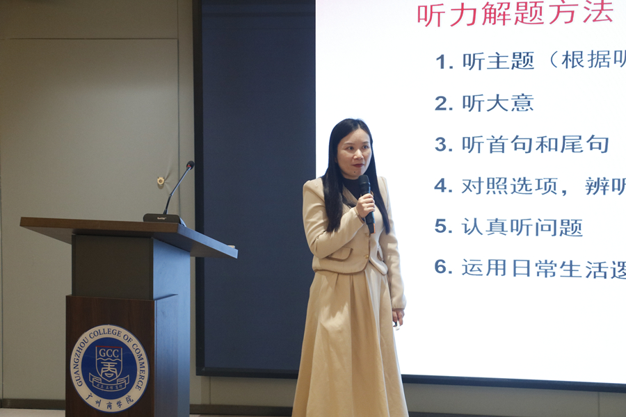 姚丽芳详细介绍了大学英语四六级听力与阅读专项的解题技巧。大学英语四六级听力题型按照从简到难,分为新闻、长对话和短文三部分,以日常生活内容为主。阅读题型主要要求学生能理解语言难度适中的一般性题材的文章。她建议学生平时多读多听,在听的过程中重点听大意,抓住要点,预览选项,边听边记,并根据日常生活逻辑进行判断;阅读解题技巧要遵循先看题再阅读文章的原则,重点突破段落信息匹配题。曹羽分析了词汇积累在听力和阅读中的重要作用。程璐娜介绍了听力和阅读部分的具体解题步骤。在互动环节中,同学们对自己在听力与阅读部分遇到的难题,向嘉宾们踊跃提问,积极交流,嘉宾们耐心给予解答。