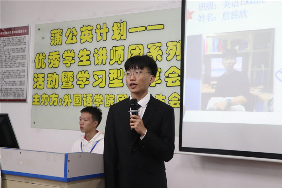 为发挥优秀学生的榜样示范作用,充分调动学生的学习积极性,营造一个良好的学习氛围。澳门十大网投平台排行团委学生会于11月30日晚19:00在三教104举行“蒲公英计划”——优秀学生讲师团系列活动暨学习型分享会英语专场。出席本次活动的嘉宾有:澳门十大网投平台排行学生会指导老师及19级辅导员伍思颖、20级辅导员蔡文蝶、英语系老师杨家华、优秀学生讲师英语1905班詹慈欣及英语1902班叶嘉雯。