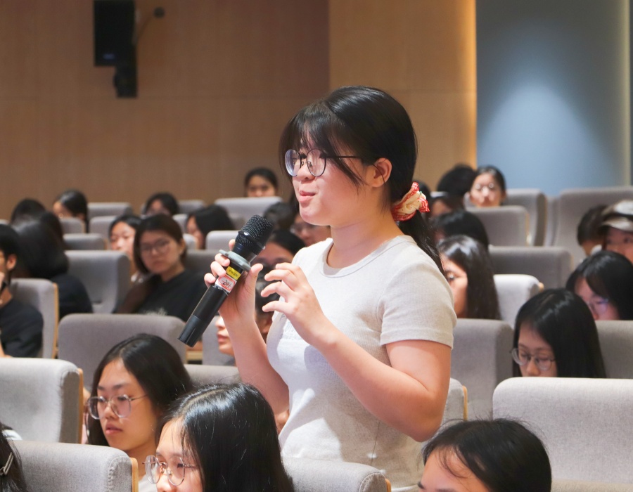 互动问答环节中,学生围绕“中国文化专有名词翻译”“阅读速度与效率如何同时提高”等问题踊跃提问,潘文晗和李静莹结合英语学习的实践经验,建议学生采用加强双语新闻的阅读,积累与中国文化相关的词汇等学习方法。本次活动,近200名学生到场参与现场交流氛围热烈,互动效果良好。