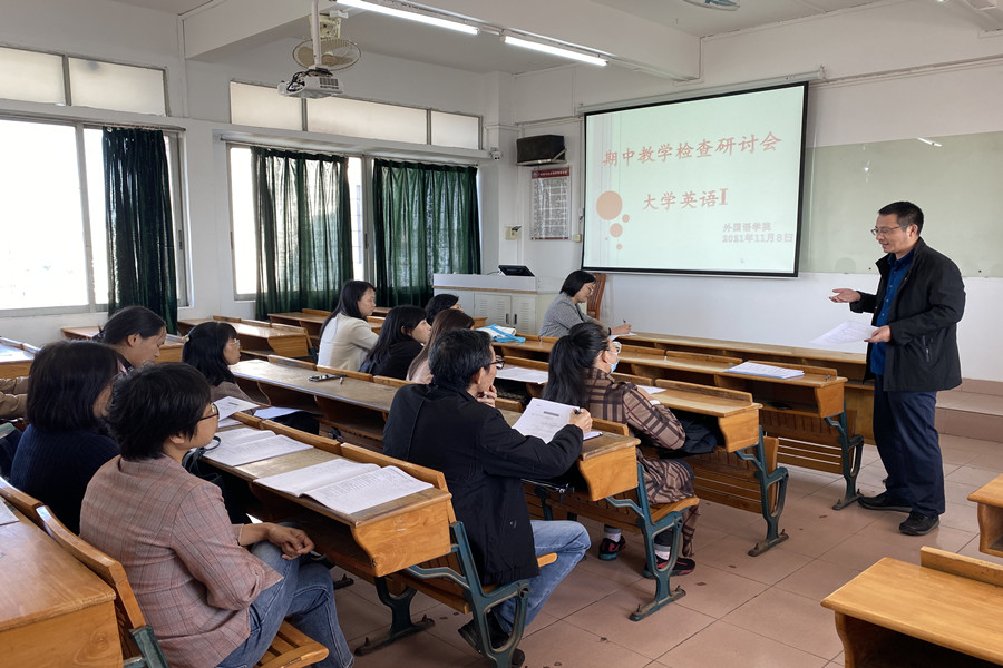 11月8日下午第六节课,澳门十大网投平台排行于三教605课室开展本学期第二场大学英语期中教学研讨课。校教务处董志邦、陈伟涛老师、督导王玉芝、十大网投平台排行副院长袁鑫及部分大学英语教师参加了本次教学观摩及研讨。
