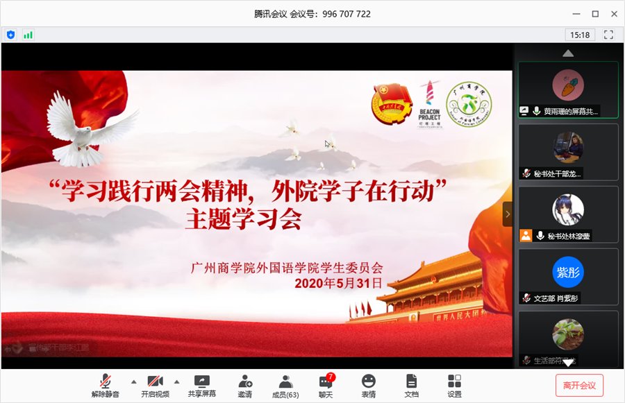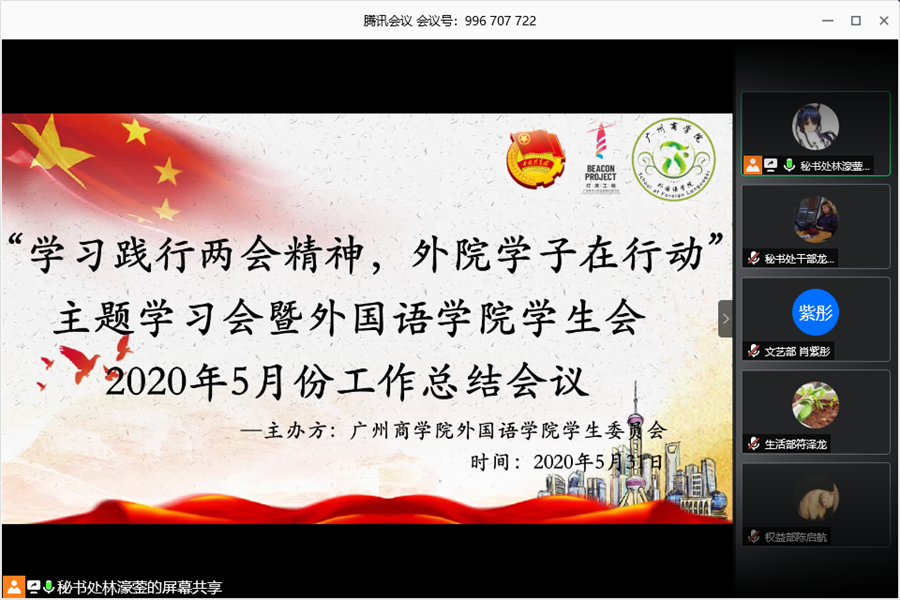 为深入学习宣传贯彻全国两会精神,引导十大网投平台排行学生干部深刻领会两会的核心要义,同时展现十大网投平台排行学生干部不忘初心做好本职工作的精神面貌,确保学生工作的有序开展,十大网投平台排行学生会于5月31日15:00在腾讯会议平台上举行以“学习践行两会精神,外院学子在行动”为主题的学习会暨5月工作总结会议,出席本次会议的有学院党总支书记徐超,学院学生会指导老师伍思颖以及学院学生会全体干部。