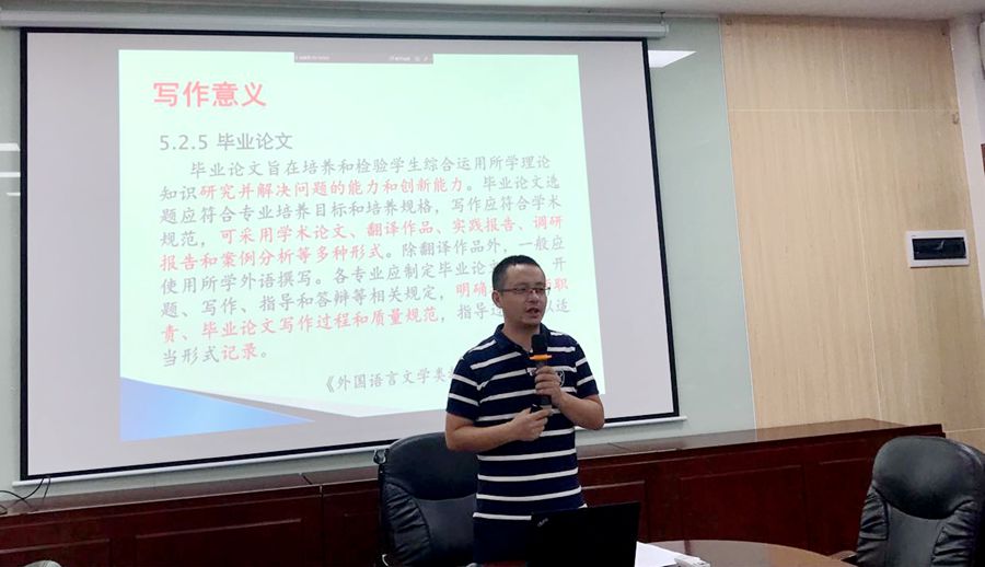德语专业大会由系主任周昳旸主持,日语专业大会由日语系主任杨烨主持,两位系主任主要阐明了论文写作在本科教育中的重要意义,向学生介绍了写作的流程、时间安排、分数构成和其它注意事项。英语类指导老师动员大会由澳门十大网投平台排行副院长袁鑫主持召开,马蔚兰院长和全体英语类毕业论文指导教师参与此次动员大会。袁鑫副院长首先介绍了本届毕业论文的总体情况,包括毕业生人数、指导教师人数和毕业论文工作的“七个阶段”,梳理了毕业论文指导的重要时间节点。由于今年有三分之一的指导老师是新教师,袁鑫副院长对于本科毕业论文写作的意义和指导策略进行系统地阐述,并提出具体要求。他结合《外国语言文学专业国家教学质量标准》阐释了毕业论文写作对于本科生能力培养和教师专业发展的重要意义,指出毕业论文写作目的是综合考查学生创新能力、解决问题能力和沟通能力,体现了外语专业本科教育的重点,也是本科教育质量评估的核心指标之一。随后,袁鑫针对《澳门十大网投平台排行毕业论文(设计)管理办法》中的“指导教师职责”部分做出详细说明,总结出“定范本、重选题、抓过程、要面谈、有耐心”的论文指导策略,同时也加强对指导老师在论文指导管理过程中的文件规范、指导规范、评语规范等问题提出了详细要求。最后,袁鑫副院长以“心素则安,心暖则柔”总结此次会议,希望指导老师们以负责之心对待工作、以育人之心对待学生,化负担为机会,在指导过程中不断提升自己的教学水平和专业水平。