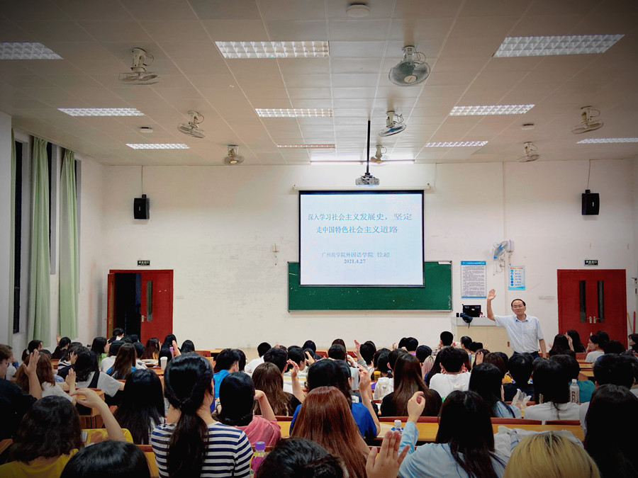 4月27日晚上,澳门十大网投平台排行2019级日语、德语专业全体同学在第四教学楼308教室举行了以“深入学习社会主义发展史,坚定走中国特色社会主义道路”为主题的书记第一课,主讲人为学院党总支书记徐超,辅导员谢清玲老师参与了本次活动。