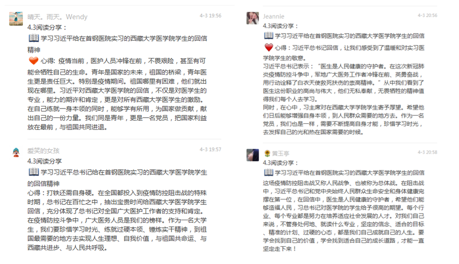 快乐阅读打卡活动为了激励同学们利用在家时间阅读交流,拓宽学术视野、滋养精神境界。全体党员线下开展自学阅读,读经典、读战“疫”故事、读成长感悟;每天在党支部微信群准时打卡,分享经典美文、诉说读书感悟、推荐好书读物。此外,党支部也在“快乐阅读打卡”活动中积极参与学习习近平总书记给在首钢医院实习的西藏大学医学院学生的重要回信精神,分享学习感悟。党员同志缪雅琪认为:疫情期间,“宅在家里做贡献”是每个中国人为战胜病毒必做的事情,这样我们也拥有了大把空余时间,静下心来,每天挑选一个最适合自己的时间点读书,用打卡让“他律”激发“自律”。这个假期也是收获满满。