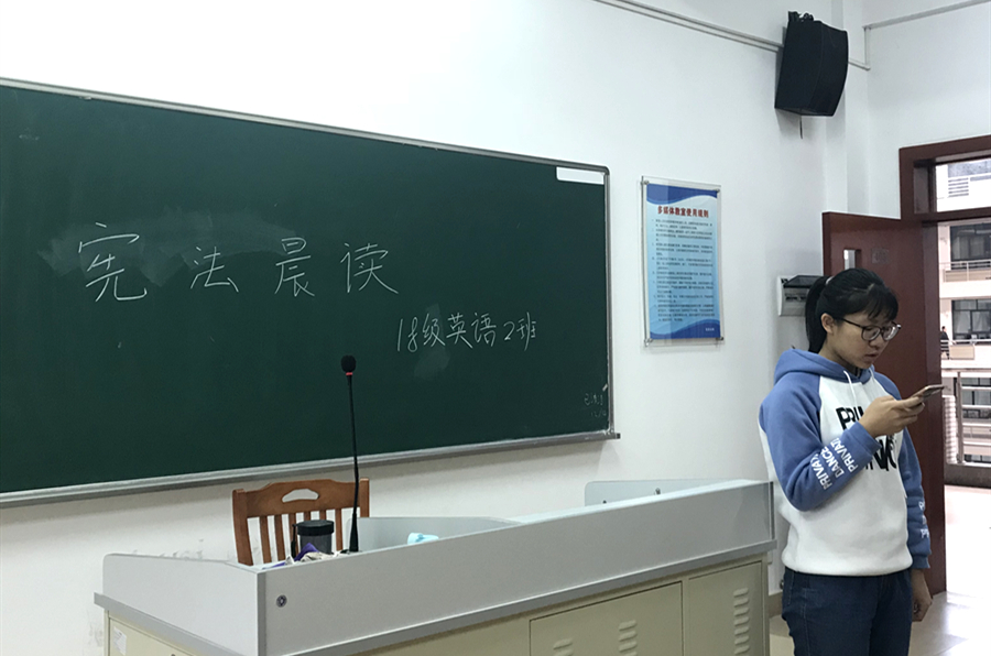 2018年12月4日是第五个国家宪法日,也是第一个“宪法宣传周”。主题是尊崇宪法、学习宪法、遵守宪法、维护宪法、运用宪法。为了积极响应教育部的号召,进一步增强学生法律意识,十大网投平台排行于当天早上7点半在多个课室同时举行宪法晨读活动。各班团支书选择宪法序言及正文中的部分章节、条款组织同学集体朗读。所有人精神饱满,情绪激昂,大声跟随诵读,用心体会宪法的庄严与神圣。