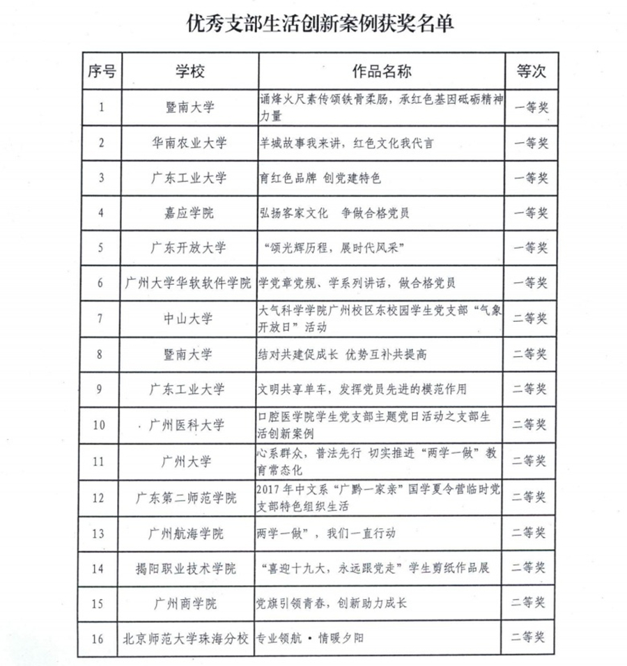 为学习宣传贯彻习近平新时代中国特色社会主义思想和党的十九大精神,推进“两学一做”学习教育常态化、制度化,发挥高校基层党支部在“两学一做”学习教育中的主题作用,2017年10月至11月,广东省教育工委组织开展了全省高校“两学一做”支部风采展示活动。