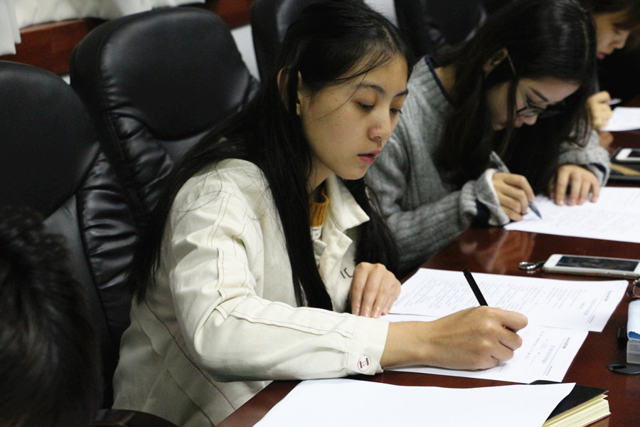 徐超首先对蓝天教育一行人的到来表示热烈欢迎,同时也希望参加招聘的毕业班同学能认真答题和说课,展现外语学子的良好风采。随后蓝天教育英语学科招聘主任陈智贤从教育行业的选择与发展前景、蓝天教育的教学模式、招聘岗位与个人晋升三大方面进行了介绍:他指出教育行业作为朝阳产业具有良好的发展前景,建议同学依据个人意愿、距离家庭远近、工作环境进行选择岗位;蓝天教育采用分层教学课程体系开展精细化英语教育,做到寓教于乐,从而保障了教学的质量。接下来,与会的同学还进行了英语教师的招考笔试环节,下午则安排了英语试讲的部分,毕业班同学认真准备,争取获得心仪的岗位。