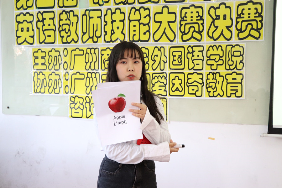 据悉,此次大赛的筹备工作从9月底开始,经过预赛、初赛、复赛、实地考察、选手培训等若干个环节,历时两个多月,最终确定12位入围选手。他们在需要在短短八分钟内,作自我介绍、课堂讲说和情景问答。在决赛舞台上,选手们各显神通,展示出了自己良好的英语表达能力和授课能力,将自己对少儿英语教育的理解完美地融入其中。蔡文蝶同学对模拟课堂的熟练把控,反映出良好的英语教师职业素养。丁洁同学准确流畅的发音以及从容大方的小教师形象深入人心;吴桐同学抓住了少儿对新鲜事物感到好奇的特点,利用图文结合的方式,生动有趣地展示了英语单词的教学过程。