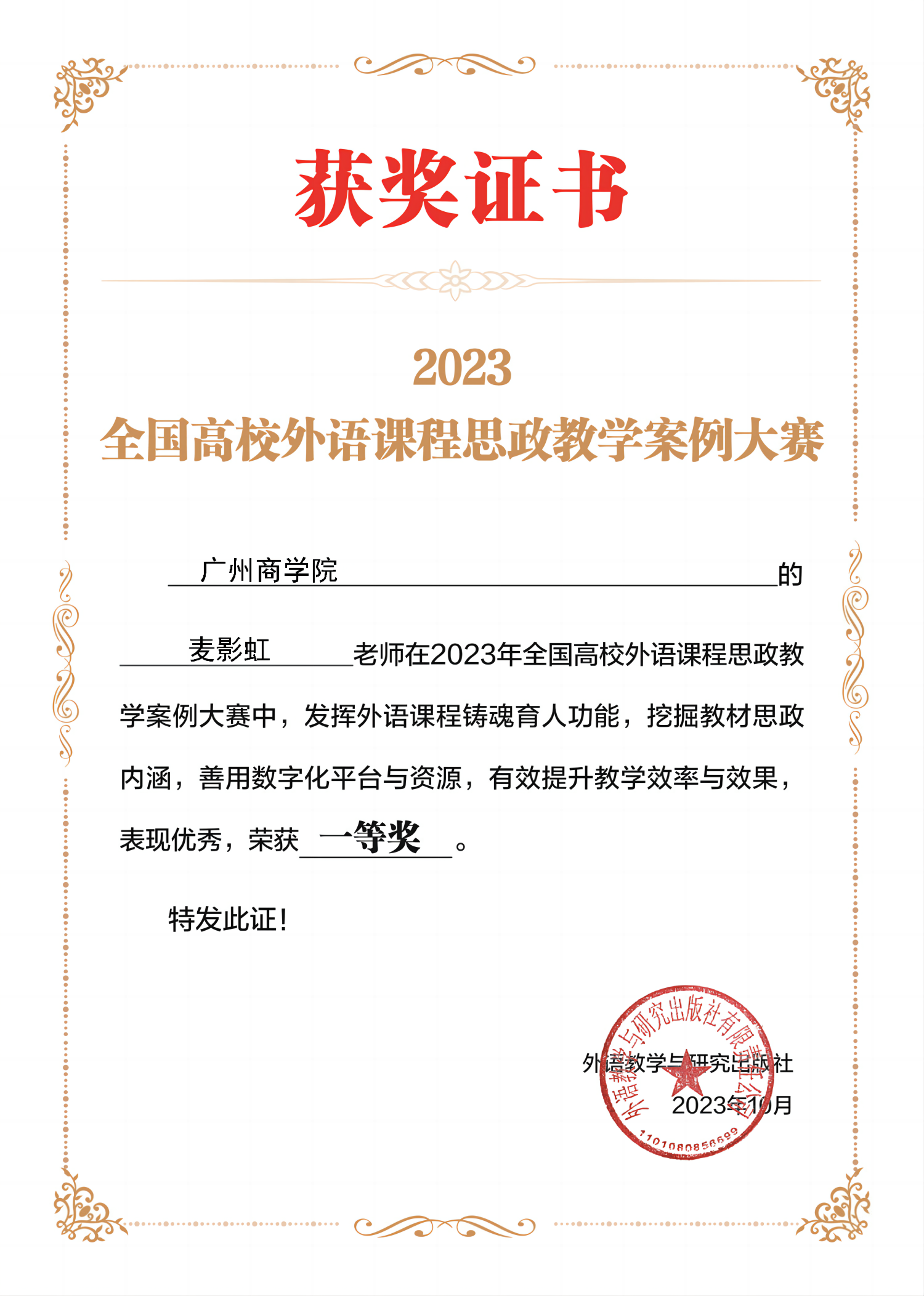 麦影虹获奖证书
