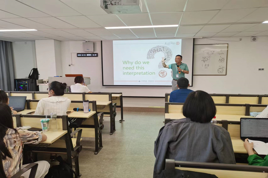 袁鑫首先指出了本次会议的目的在于解读教学比赛评分标准,促进教师用评分标准指导课堂教学,他希望全体新教师能够通过此次培训,掌握课程教学的基本组织原则和各环节的教学方法,实现课堂教学的规范化。陈刚对评分标准进行了解读。他改变通常的讲座方式,结合课堂教学方法,通过多种模式与在座的教师进行互动,并在过程中分析自身在课堂管理和教学方法上出现的各种问题。他指出teachers are trained professionals, 一位合格的教师必须掌握一定的教学理念和教学技巧,其专业性都是要经过一段时间的训练才能具备。评分标准不仅用于比赛评分,同时也是对课堂教学环节规范的描述体系,对于指导教学有较强的指导意义。陈刚详细分析了评分标准的各个构念及其参数,具体要求体现为:1、教学档案应规范美观;2、教学目标适切、明确;3、教学设计具有高阶性、创新性和挑战度;4、课堂管理能够实现师生的良性互动;5、教学过程系统高效;6、具有较高的技术素养;7、教学效果良好,学生乐学会学。