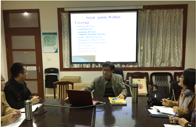 沙龙的第二部分是教师的备课演示。赖宝滢老师分享了她第一单元的课程设计思路,由教学目标和要求、引入、整体理解、细节讲解以及课后拓展和练习6部分组成。以学生感兴趣的“旅游”为话题,设计了一系列的活动以训练学生的听、说、读、写能力,把商务英语的知识融入在教学里,让学生能更好地去理解课文的内容和背景知识。分享结束后,大家都提出了自己的看法,曾教授也提出了改进意见,结合教学过程中出现的一些问题,一起商量解决的办法,现场气氛热烈。