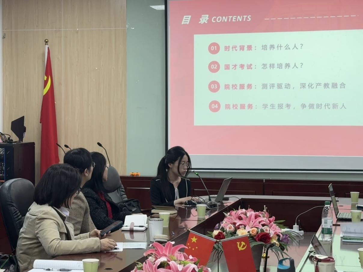 在两方交流答疑环节中,与会教师积极提问,围绕国才考试的推广难点、学生参与动力及考试价值等议题展开深入探讨等问题展开讨论。石文曦建议通过课程改革将国才考试内容融入日常教学,并通过政策激励提高学生参与考试的积极性。她还提到,考试设计兼顾初级至高级多层次能力认证,初级考试对标大学英语六级水平,且通过“奖学金优惠券”政策(如初级考试费用返还用于后续中级报考)可大幅降低学生试错成本,鼓励学生以考促学、循序渐进提升能力。而针对学生“重证书含金量、轻备考动力”现象,学院教师提出将考试真题资源融入日常教学、结合学分转换政策引导学生参与,并通过简历案例对比直观呈现证书对就业竞争力的提升作用。双方一致认为,需以国才考试为纽带,联动课程改革、双师型队伍建设及校企合作,构建“教学—测评—就业”一体化培养体系,切实推动国际化应用型人才培养。