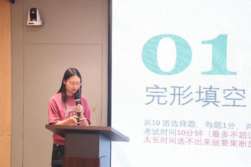 活动伊始,徐超书记在致辞中强调,英语专业四级考试是学术生涯中的一个重要节点,成功通过考试需要扎实的基础和科学的备考方法。他结合自身经验,详细讲解了备考资料的选择、考试时间安排以及成绩评定标准,明确了同学们备考的方向。接着,石子豪老师从考试题型、备考策略等方面为同学们提供了有针对性的建议,特别强调了词汇积累、听力训练和发音练习的重要性,并鼓励大家通过刷题不断提高做题技巧。