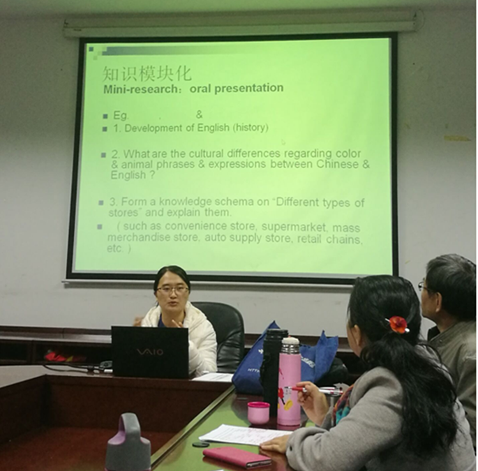 王老师教授的课程是《高级商务英语》,对于高年级的学生,王老师主要是以商务报告作为检查学生学习效果的方法,每学完一课,王老师都会让班里的学生写一篇商务报告,分析各种商务类报刊杂志里面的一篇文章,按照文章难度、难题解决、拓展性阅读、拓展性阅读的应用以及知识图式的建立五个方面给予分数。王老师说,学生一开始的完成度并不高,后来越做越好,在这个过程当中感觉到了学生的潜力一点一点地被开发出来。从不会分析到方方面面井井有条,处处是惊喜。最后,王老师总结了商务英语教学的方法:主题话题性、表达地道性、商科知识性、谋篇策略性、商英体系性。