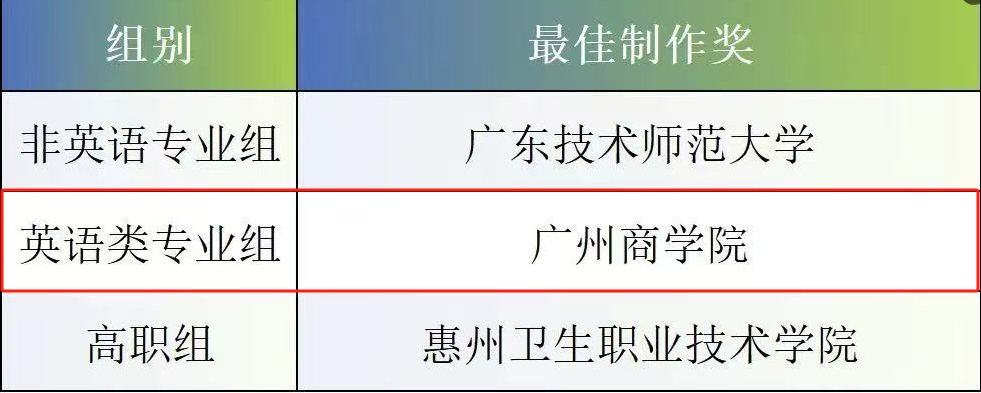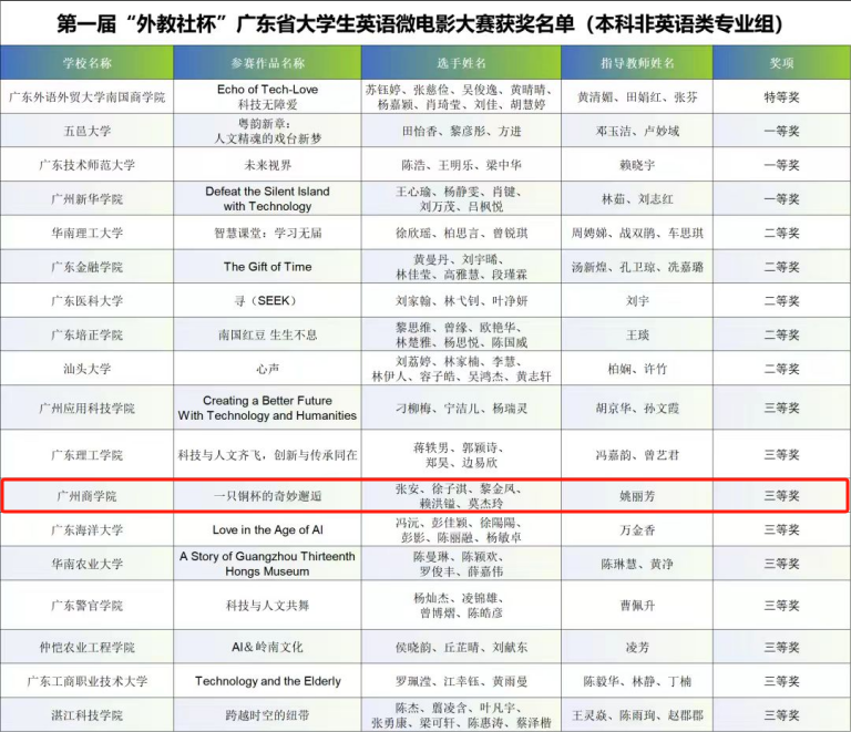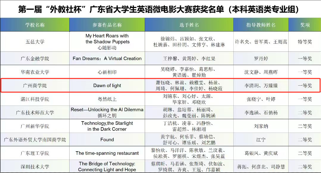 近日,第一届“外教社杯”广东省大学生英语微电影大赛圆满落幕。十大网投平台排行选派两支队伍参赛,经过激烈角逐,荣获一等奖1项、三等奖1项以及最佳制作奖。