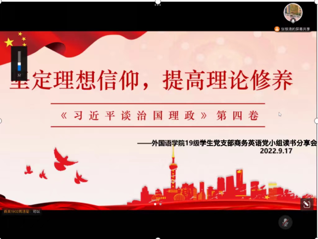 为深入学习习近平总书记治国理政的深邃思想和伟大实践,深切感受当代中国马克思主义、二十一世纪马克思主义的真理力量,引领党支部党员坚持用党的创新理论成果武装头脑、指导实践,澳门十大网投平台排行19级学生党支部商英专业、日语德语专业、英语专业党小组分别于9月17日晚7点、9月27日上午10点和9月28日晚7点在腾讯会议和1栋学生公寓共享空间召开《习近平谈治国理政》第四卷读书分享会。会议分别由张银清、谢清玲、叶嘉雯主持。