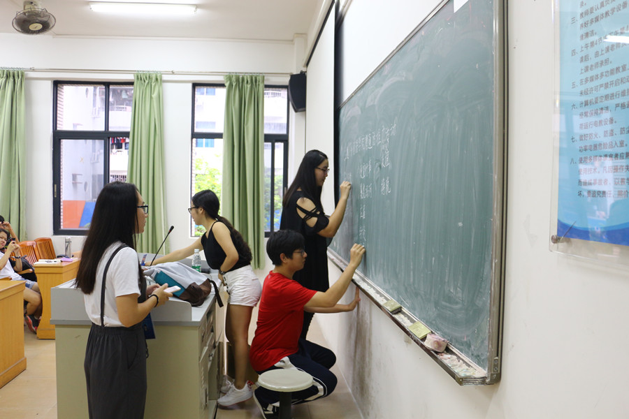 同学在班会上挑战粉笔规范字