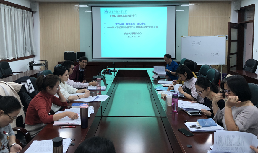 2019年12月25日下午四点,第68期商务英语学术沙龙在澳门十大网投平台排行第二行政楼308会议室举行,本次沙龙的研讨主题是“学术研究•经验感性•理论感性——从《习近平谈治国理政》英译本的若干问题谈起”。沙龙由学科带头人曾利沙教授主持,商务英语系全体教师参加了此次沙龙。