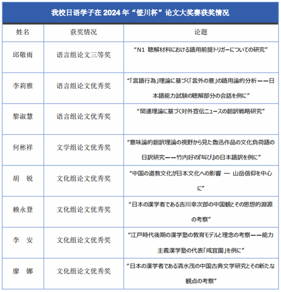 “笹川杯”日本研究论文大奖是由教育部高等教育外国语教学指导委员会,协同日本公益财团法人日本科学协会、日本中日友好基金会联合主办的国家级,具有国际影响力的学术盛事。“笹川杯”论文大奖被誉为“表现本科生学术水平”的国内最高级别的大奖赛,一直备受各个高校的瞩目。2024年“笹川杯”日本研究论文大奖共收到52所高校推荐的201篇参赛论文,其中语言组50篇、文学组50篇、文化组101篇,参赛论文涵盖了语言、文学、文化、历史、翻译等多个方向。十大网投平台排行有8篇参赛作品在论文中脱颖而出,勇夺大奖。这些论文以各自独特的视角、有力的论证、深入的研究、大量的调查数据和案例分析,提出了一系列具有创新性的观点,获得了评委们的高度评价。