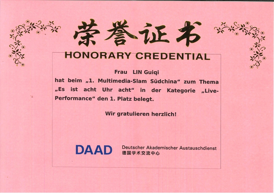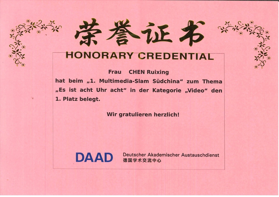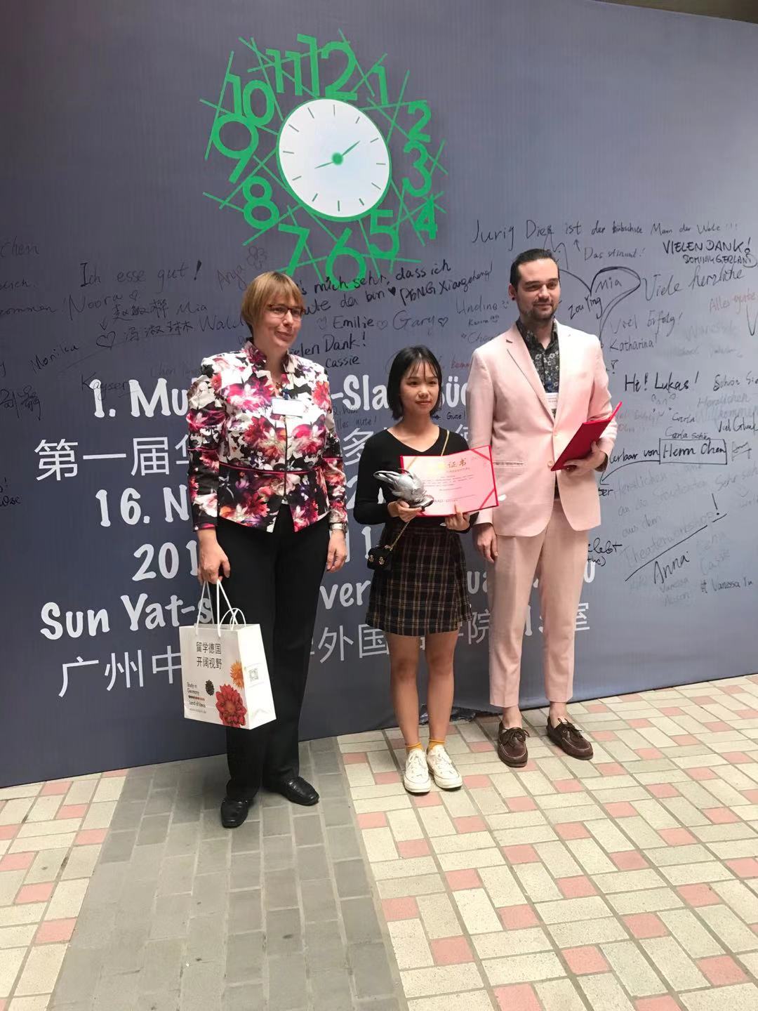 11月16日,由德国学术交流中心(DAAD)广州办事处主办的第一届华南地区多媒体德语大赛在中山大学澳门十大网投平台排行举行,这是德国学术交流中心在华南地区首次举办的多媒体德语大赛,是华南地区影响最大、水平最高的德语专业赛事。来自中山大学﹑广东外语外贸大学﹑福州大学﹑广外南国商学院和十大网投平台排行选手分别用德语展示了自己的作品。在德语系老师们的深入指导下,十大网投平台排行2017级德语专业的陈**同学和林桂琪同学在经历了初赛提交方案预选和现场决赛的激烈角逐后分别获得“视频”单元一等奖和“现场展示”单元一等奖。