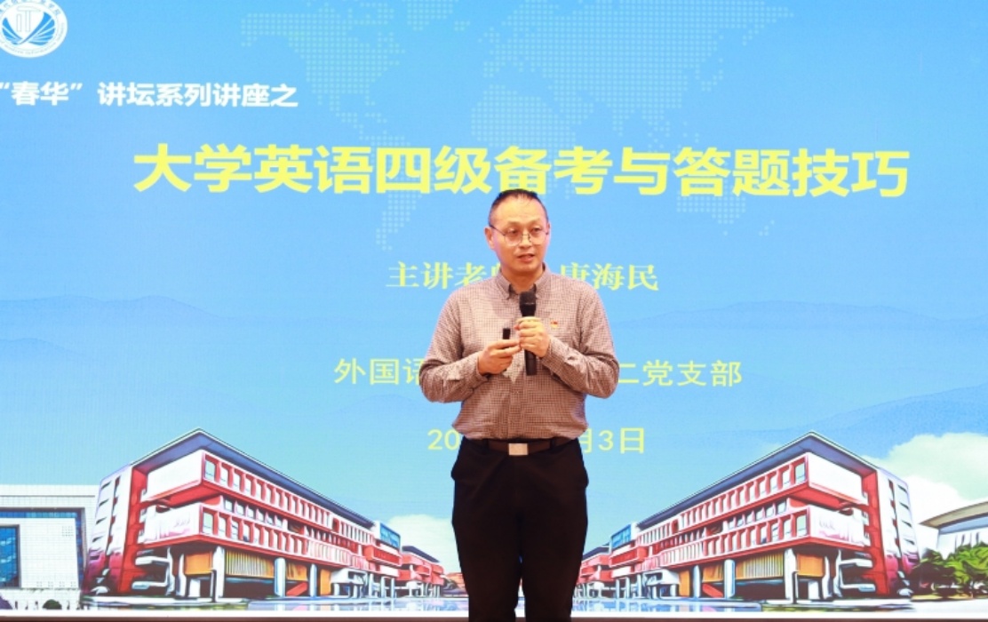 为深入学习贯彻中央八项规定精神,扎实推进党的作风建设,积极打造“我为群众办实事”党建品牌,4 月 17 日,澳门十大网投平台排行教工第二党支部联合现代信息产业学院,在第八教学楼 204 报告厅举办 “春华讲坛”大学英语四六级考试专题辅导讲座。本次讲座是澳门十大网投平台排行第二届外语文化节的活动之一,由澳门十大网投平台排行教工党支部书记唐海民老师主讲。