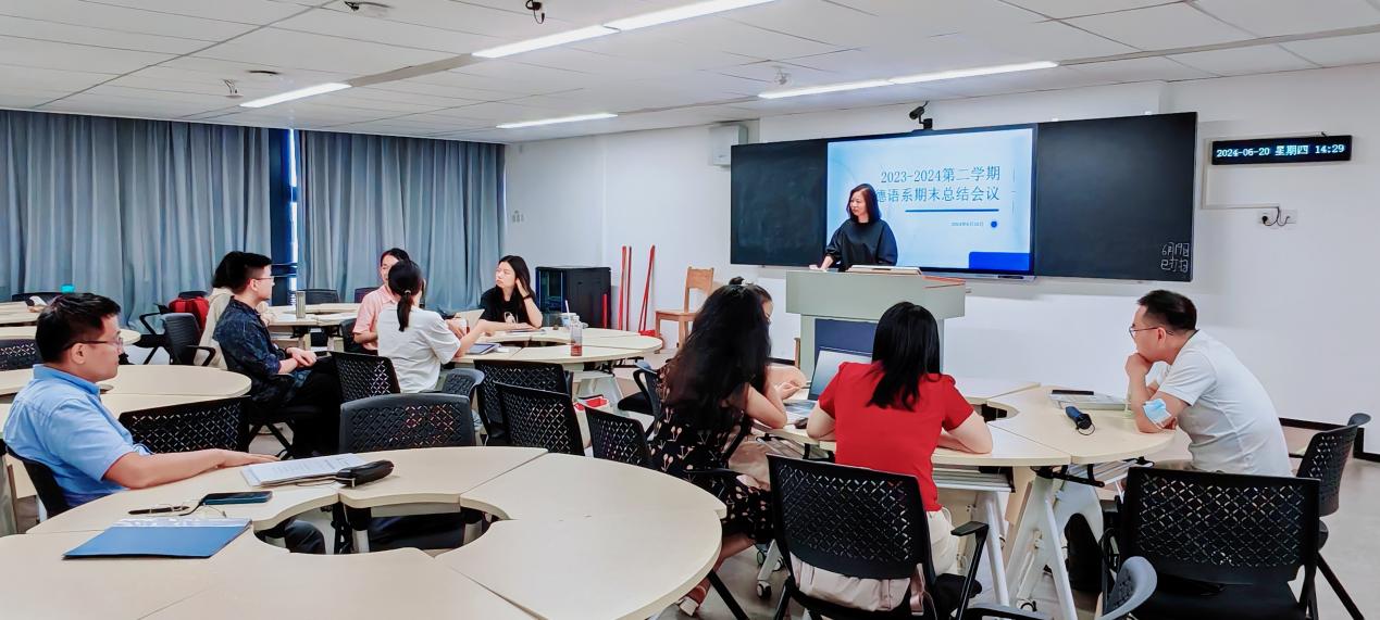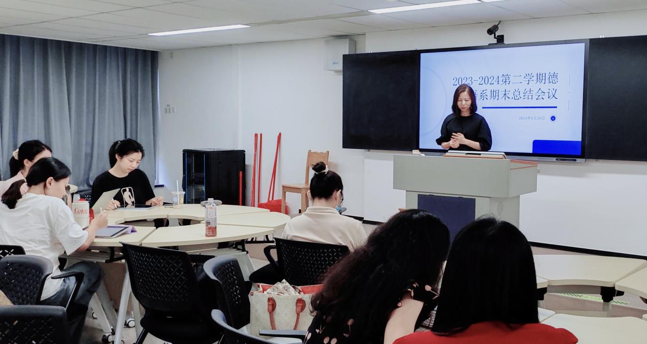 会议伊始,德语系主任周昳旸老师对本学期的工作进行了全面总结。她指出,在全体教师的共同努力下,德语系在课程建设、教学方法改革等方面取得了一定的进步。通过引入现代化教学手段和技术,有效提升了课堂教学的互动性和学生的参与度。招生宣传方面,各位老师集思广益,群策群力完成了招生宣传视频的制作工作。第二课堂方面,本学期德语协会组织多场活动,如配音大赛、演讲大赛、朗诵比赛等,通过以赛促学的方式提升了学生德语学习的积极性。在教师发展方面,本学期举办了各类学术沙龙、创新分享会,主题包括新质生产力在外语教学中的应用、国际期刊上的刊物发表策略、数字人文对外语教育的启示等。