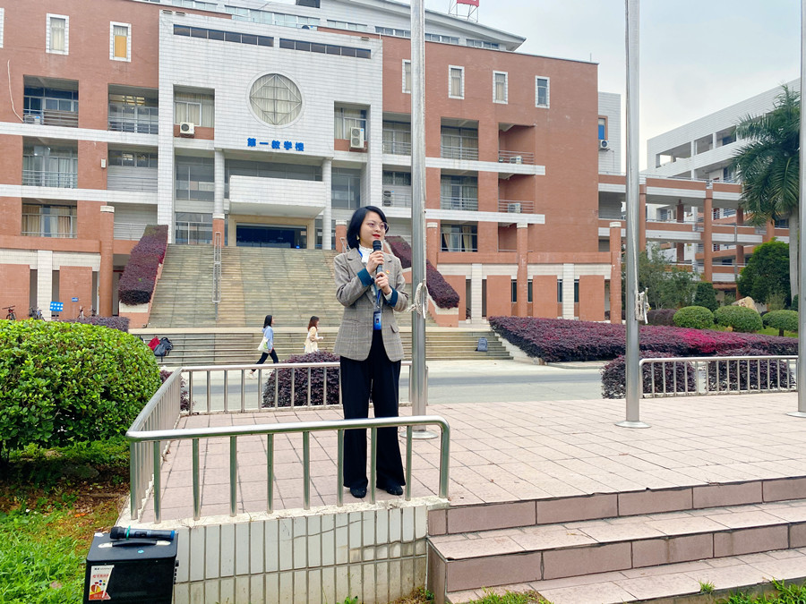 许嘉琪进行了主题为《国旗,伴我成长》的爱国主义教育并向学生提出了殷切希望。她指出,当注视缓缓升起的国旗,齐唱着雄壮的国歌,享受着快乐的大学时光之际,我们青年大学生一定要心存感恩,感谢党和祖国带给我们的幸福生活,同时更应该主动承担自己的历史责任,努力学习,好好工作,努力成长为一名优秀的社会主义建设者与接班人。伍思颖对学校迎评促建工作进行了宣讲,详细部署了学院“展广商形象,迎合格评估,庆建党百年”系列活动,教育引导同学们树立“校荣我荣”的观念,以最好的风貌迎接评估工作的到来,努力为学校的建设发展添砖加瓦。