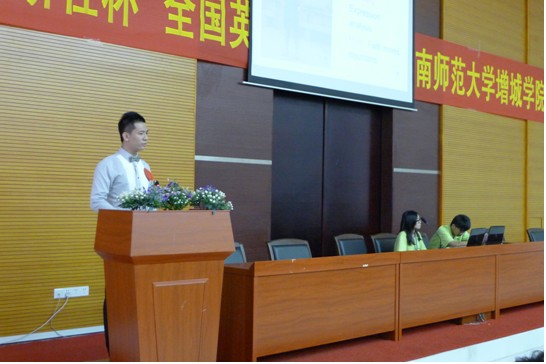 2012年5月25日下午,由教学处主办、外语系承办、学院英语口语协会协办的2012年“外研社杯”全国英语演讲比赛选拔赛暨华南师范大学增城学院决赛在图书报告厅圆满地落下了帷幕。学院副院长刘根正,外语系主任胡光忠,学生处副处长何柏略,教学处处长助理何茂炳,外语系党总支书记徐超,以及外语系各位老师出席了本次比赛。