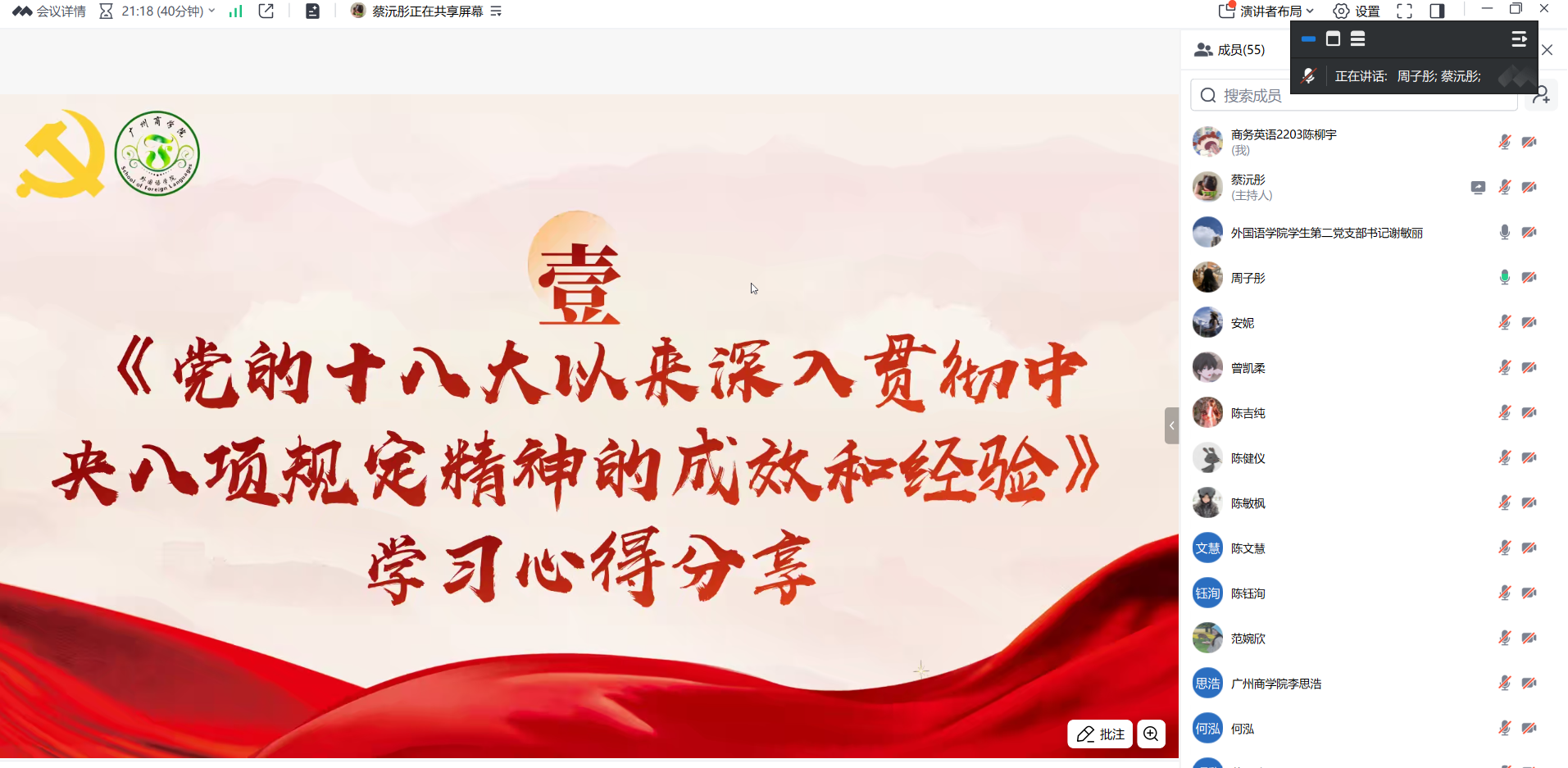 为扎实推进深入贯彻中央八项规定精神学习教育,持续强化党员对中央八项规定精神的理解与落实,进一步增强廉洁自律意识,澳门十大网投平台排行学生第二党支部于8月13日在腾讯会议召开党的十八大以来深入贯彻中央八项规定精神的成效和经验专题学习会。本次会议由学生党员蔡沅彤主持,学生第二党支部全体党员参会。