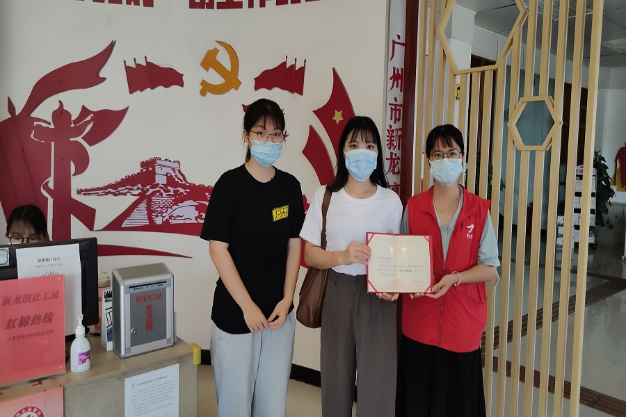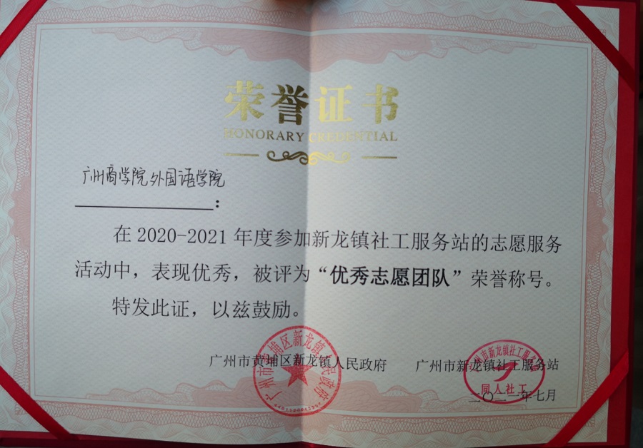 2021年9月7日,澳门十大网投平台排行阳光展翅实践队在“2020-2021年度参加新龙镇社工服务站的志愿服务”活动中被评为“优秀志愿团队”荣誉称号。