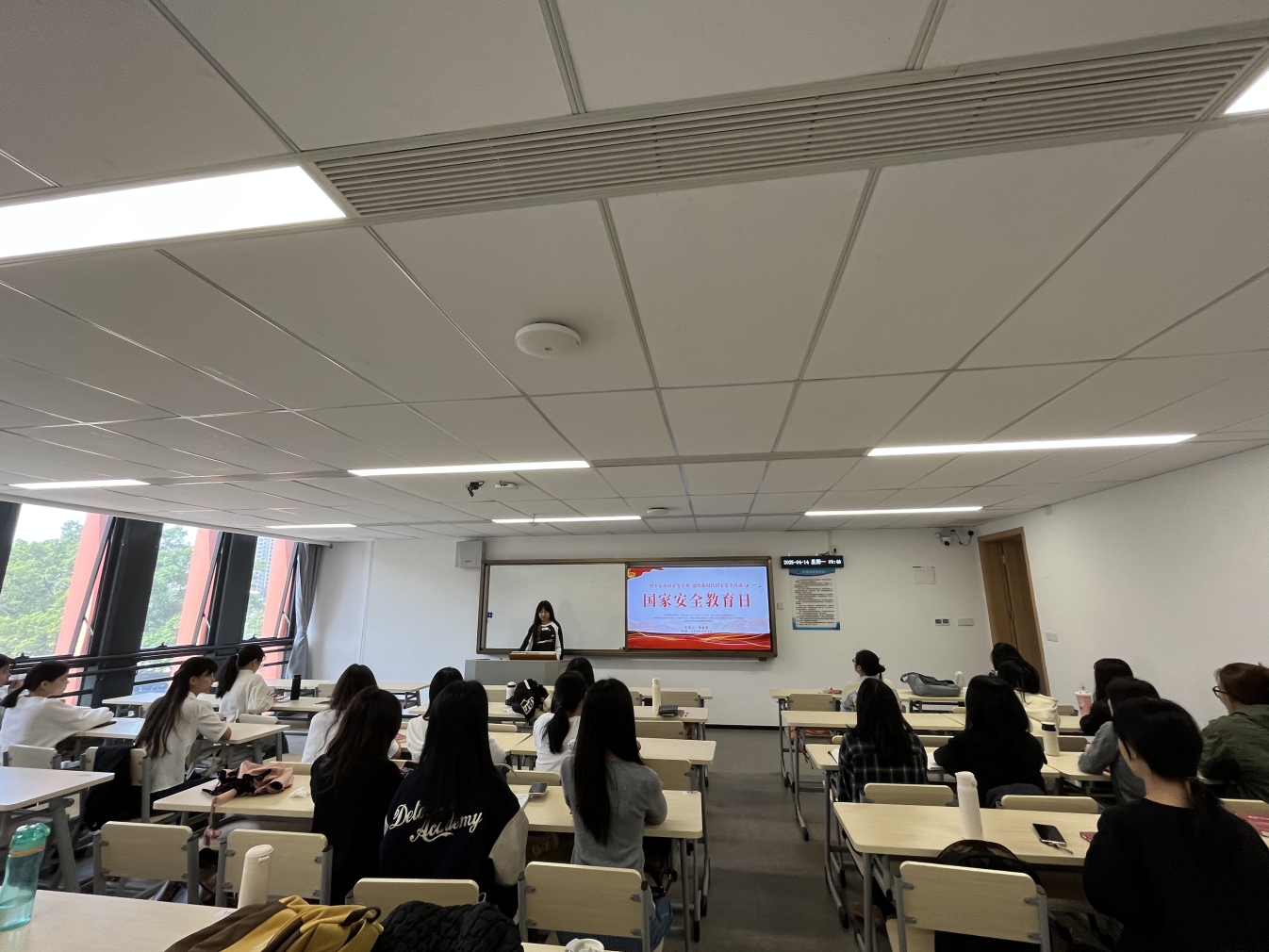 班会由各班班委主持,以“案例解析+互动研讨”形式层层深入。围绕网络安全、学术保密、文化安全等高校重点领域,班委通过PPT演示,拆解“校园信息泄露”“境外学术调研陷阱”等典型案例,详解防范技巧。在“安全隐患我排查”互动环节,学生结合外语学习实践,分享外文平台信息辨别、国际交流安全规范等感悟,实现国安知识与专业学习深度融合,现场氛围良好。