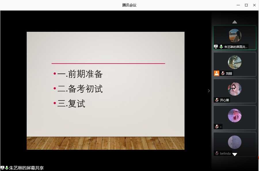 会前,主持人对参与本次分享会的分享嘉宾作了简要的介绍,然后由四位分享嘉宾分别进行经验分享。第一位分享的是16级英语专业的朱艺琳同学,她着重讲考研的前期准备,其中主要强调了择校的重要性,详细介绍了学科英语考试科目的题型和教材并就此分享了复习技巧。紧接着,16级英语专业王思丽同学讲述了广东技术师范大学的招生情况,公费定向培养模式,考研流程,各科教材购买注意点,还分享了复试科目的题型重点和面试形式。同样来自于16级英语专业的王佳会同学主要介绍了院校调剂问题以及各科不同阶段的复习计划。16级德语专业的黄晓宜同学主要分享了考取翻译硕士的经验并强调了学习真题的重要性。黄晓宜提到,只有先找真题进行分析,才能找准自己的备考方向。在这次线上会议中,同学们认真倾听各位师姐的考研经验和提分技巧,积极参与互动,踊跃提出自己的疑问,16级四位同学耐心解答,线上分享会的气氛十分活跃。